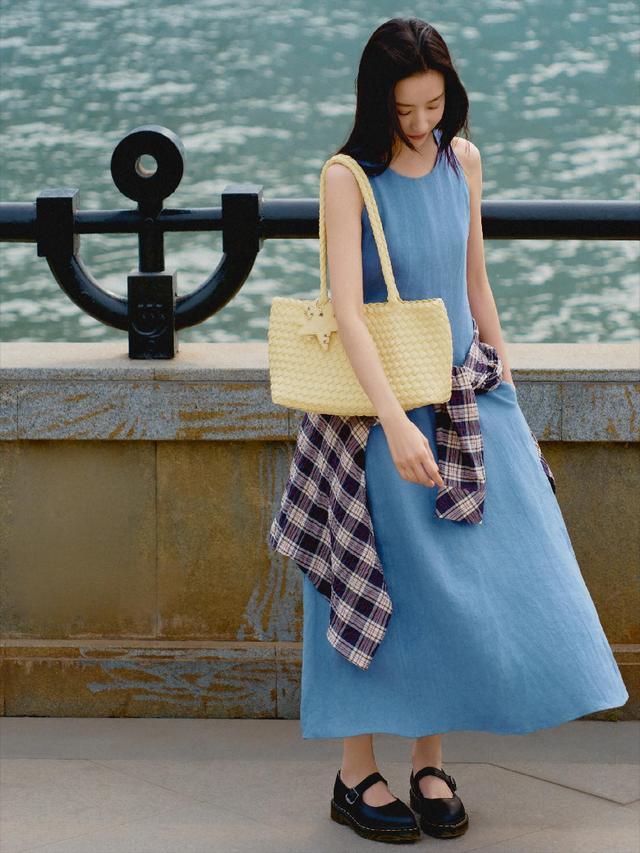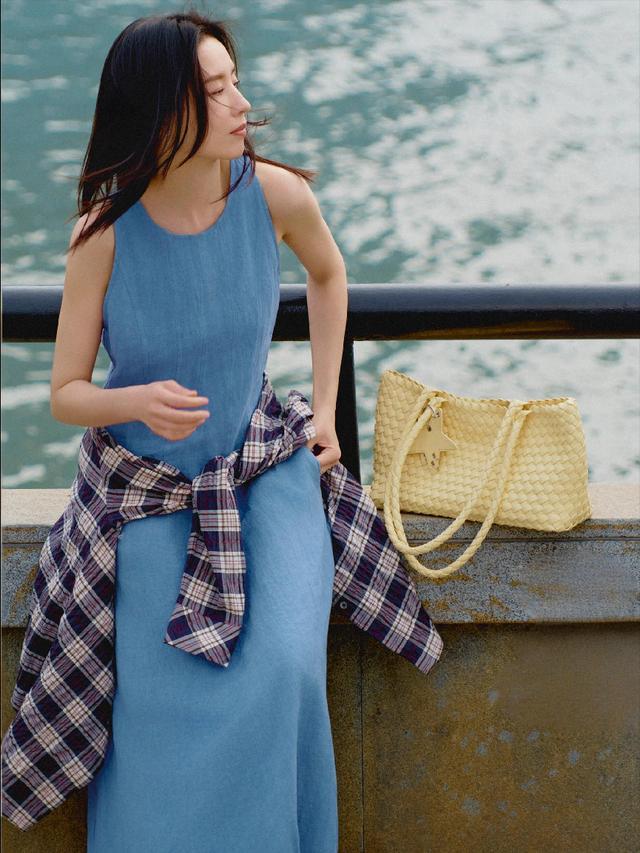 无袖裙是圆领设计,面料的垂坠感任谁看了都想多看几眼;而且亚麻面料透气又舒服,自带清爽的松弛感。腰间随意系了件格子衬衫,下摆垂下来,刚好遮住腰胯,还多了点层次感,也给整体造型添了几分随性的味道。肩上挎着一只鹅黄色的编织托特包,包身是编织纹理,还别了个星星小装饰,颜色和蓝色裙子搭在一起,特别亮眼。