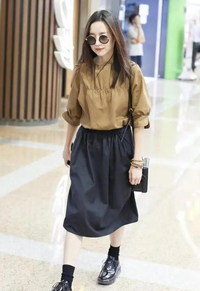 半身裙是中长款,裙摆长度刚好到小腿中部;松紧腰的设计十分讨喜,腰部肌肤可自由呼吸;裙身是那种微微散开的A字版型,面料看着挺括,带点垂坠感,不会让人觉得软塌塌,藏肉效果也很自然。双脚穿的是黑色厚底小皮鞋,带点英伦风,鞋面上有系带设计,搭配了黑色的中筒袜,袜子堆在脚踝处,显得腿型很利落,也中和了厚底鞋的笨重感。