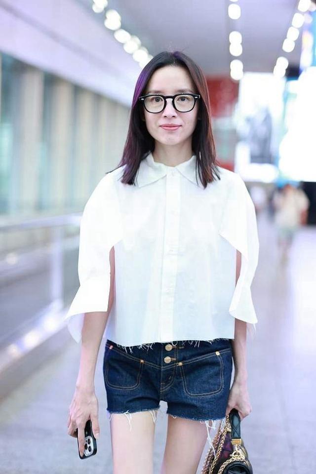 上半身穿了一件白衬衫,版型融入了巧思,娃娃领的设计软乎乎的,不是那种板正的尖领,看着特别清爽。袖子是很宽松的喇叭中袖,侧面还有开衩,不是贴在胳膊上的那种,风一吹就晃,自带点随性的感觉。此外,衣长偏短,下摆带着点毛边,不是规规矩矩的收边,因此无形间透着点松弛劲儿。腿上穿的是深蓝色牛仔短裤,映入眼帘的是低腰设计,两颗金色的排扣明晃晃的,和普通短裤不太一样。